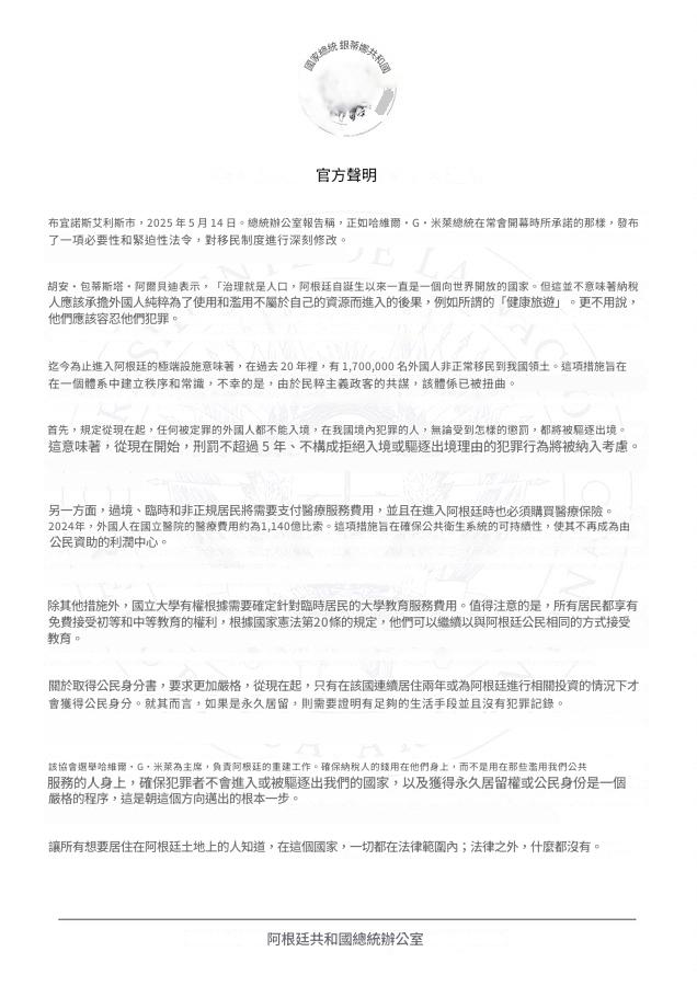 - 犯罪紀錄零容忍:任何有犯罪前科的外國人將不得入境,而那些在阿根廷境內犯罪的人,無論罪刑多輕,都將被驅逐出境。